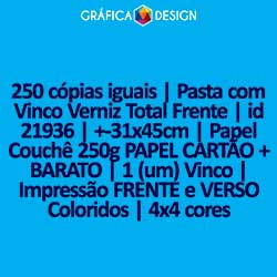 250 cópias iguais | Pasta com Vinco Verniz Total Frente | id 21936 | +-31x45cm | Papel Couchê 250g PAPEL CARTÃO + BARATO | 1 (um) Vinco | Impressão FRENTE e VERSO Coloridos | 4x4 cores