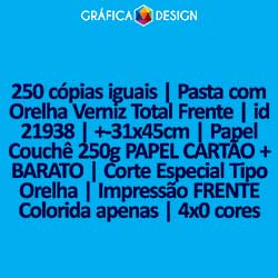 250 cópias iguais | Pasta com Orelha Verniz Total Frente | id 21938 | +-31x45cm | Papel Couchê 250g PAPEL CARTÃO + BARATO | Corte Especial Tipo Orelha | Impressão FRENTE Colorida apenas | 4x0 cores
