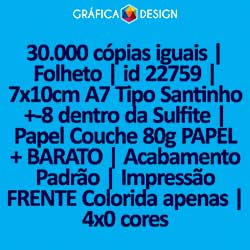 30.000 cópias iguais | Folheto | id 22759 | 7x10cm A7 Tipo Santinho +-8 dentro da Sulfite | Papel Couchê 80g PAPEL + BARATO | Impressão FRENTE Colorida apenas | 4x0 cores