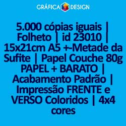 5.000 cópias iguais | Folheto | id 23010 | 15x21cm A5 +-Metade da Sulfite | Papel Couchê 80g PAPEL + BARATO | Impressão FRENTE e VERSO Coloridos | 4x4 cores