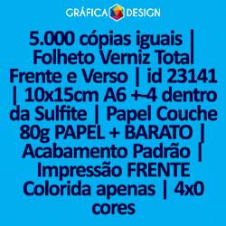 5.000 cópias iguais | Folheto Verniz Total Frente e Verso | id 23141 | 10x15cm A6 +-4 dentro da Sulfite | Papel Couchê 80g PAPEL + BARATO | Impressão FRENTE Colorida apenas | 4x0 cores