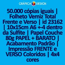 50.000 cópias iguais | Folheto Verniz Total Frente e Verso | id 23162 | 10x15cm A6 +-4 dentro da Sulfite | Papel Couchê 80g PAPEL + BARATO | Impressão FRENTE e VERSO Coloridos | 4x4 cores