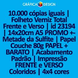 10.000 cópias iguais | Folheto Verniz Total Frente e Verso | id 23194 | 14x20cm A5 PROMO +-Metade da Sulfite | Papel Couchê 80g PAPEL + BARATO | Impressão FRENTE e VERSO Coloridos | 4x4 cores