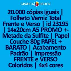 20.000 cópias iguais | Folheto Verniz Total Frente e Verso | id 23195 | 14x20cm A5 PROMO +-Metade da Sulfite | Papel Couchê 80g PAPEL + BARATO | Impressão FRENTE e VERSO Coloridos | 4x4 cores