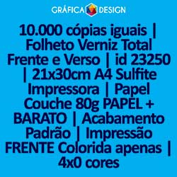 10.000 cópias iguais | Folheto Verniz Total Frente e Verso | id 23250 | 21x30cm A4 Sulfite Impressora | Papel Couchê 80g PAPEL + BARATO | Impressão FRENTE Colorida apenas | 4x0 cores