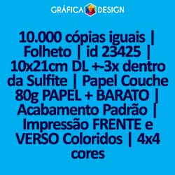10.000 cópias iguais | Folheto | id 23425 | 10x21cm DL +-3x dentro da Sulfite | Papel Couchê 80g PAPEL + BARATO | Impressão FRENTE e VERSO Coloridos | 4x4 cores