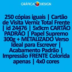 250 cópias iguais | Cartão de Visita Verniz Total Frente | id 24476 | 5x9cm CARTÃO PADRÃO | Papel Supremo 300g + METALIZADO Verso Ideal para Escrever | Impressão FRENTE Colorida apenas | 4x0 cores