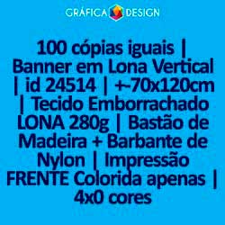 100 cópias iguais | Banner em Lona Vertical | id 24514 | +-70x120cm | Tecido Emborrachado LONA 280g | Bastão de Madeira + Barbante de Nylon | Impressão FRENTE Colorida apenas | 4x0 cores