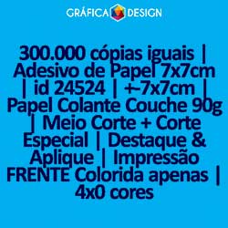 300.000 cópias iguais | Adesivo de Papel 7x7cm | id 24524 | +-7x7cm | Papel Colante Couchê 90g | Meio Corte + Corte Especial | Destaque & Aplique | Impressão FRENTE Colorida apenas | 4x0 cores