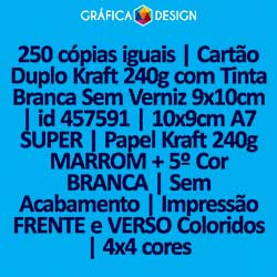 250 cópias iguais | Cartão Duplo Kraft 240g com Tinta Branca 9x10cm | id 457591 | 10x9cm A7 SUPER | Papel Kraft 240g MARROM + 5º Cor BRANCA | Impressão FRENTE e VERSO Coloridos | 4x4 cores