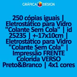 250 cópias iguais | Eletrostático para Vidro "Colante Sem Cola" | id 25235 | +-17x10cm | Eletrostático para Vidro "Colante Sem Cola" | Impressão FRENTE Colorida VERSO Preto&Branco | 4x1 cores