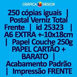 250 cópias iguais | Postal Verniz Total Frente | id 25323 | 18x10cm A6 EXTRA | DL Reduzido | Papel Couchê 250g PAPEL CARTÃO + BARATO | Impressão FRENTE Colorida apenas | 4x0 cores