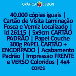 40.000 cópias iguais | Cartão de Visita Laminação Fosca e Verniz Localizado | id 26115 | 5x9cm CARTÃO PADRÃO | Papel Couchê 300g PAPEL CARTÃO + ENCORPADO | Impressão FRENTE e VERSO Coloridos | 4x4 cores