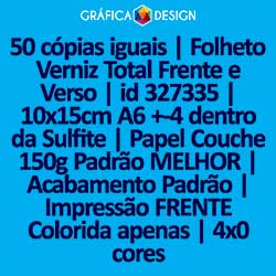 50 cópias iguais | Folheto Verniz Total Frente e Verso | id 327335 | 10x15cm A6 +-4 dentro da Sulfite | Papel Couchê 150g Padrão MELHOR | Impressão FRENTE Colorida apenas | 4x0 cores