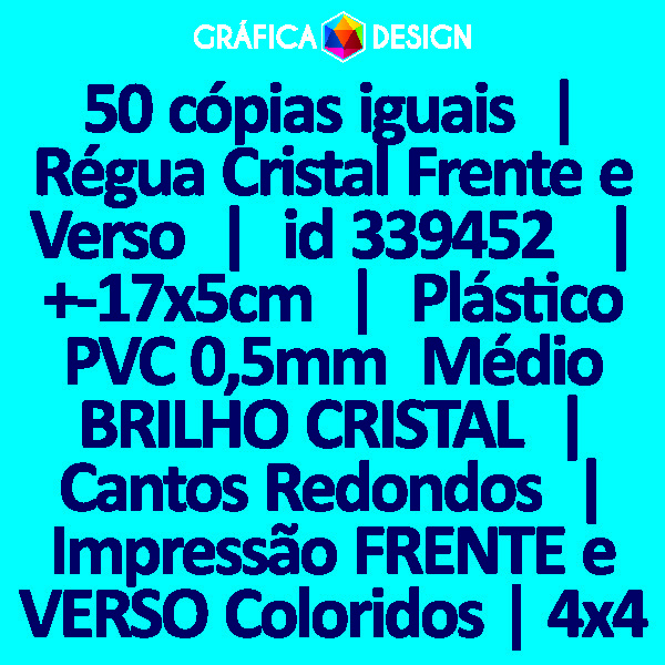 E-mail LUIZ@GRAFICA.DESIGN50 cópias iguais | Régua Cristal Frente e Verso | id 339452 | +-17x5cm | Plástico PVC 0,5mm Médio BRILHO CRISTAL | Cantos Redondos | Impressão FRENTE e VERSO Coloridos | 4x4 cores
