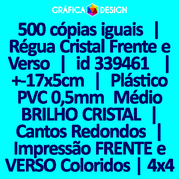 E-mail LUIZ@GRAFICA.DESIGN500 cópias iguais | Régua Cristal Frente e Verso | id 339461 | +-17x5cm | Plástico PVC 0,5mm Médio BRILHO CRISTAL | Cantos Redondos | Impressão FRENTE e VERSO Coloridos | 4x4 cores