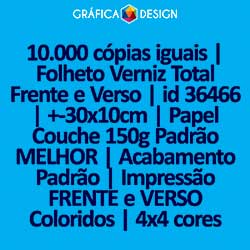 E-mail LUIZ@GRAFICA.DESIGN10.000 cópias iguais | Folheto Verniz Total Frente e Verso | id 36466 | +-30x10cm | Papel Couchê 150g Padrão MELHOR | Impressão FRENTE e VERSO Coloridos | 4x4 cores