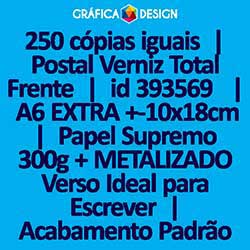 250 cópias iguais | Postal Verniz Total Frente | id 393569 | 18x10cm A6 EXTRA | DL Reduzido | Papel Supremo 300g + METALIZADO Verso Ideal para Escrever | Impressão FRENTE Colorida apenas | 4x0 cores