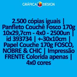 2.500 cópias iguais | Panfleto Couchê Fosco 170g 10x29,7cm - 4x0 - 2500un | id 393734 | +-30x10cm | Papel Couchê 170g FOSCO, NOBRE & CHIC | Impressão FRENTE Colorida apenas | 4x0 cores