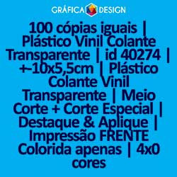 100 cópias iguais | Plástico Vinil Colante Transparente | id 40274 | +-10x5,5cm | Plástico Colante Vinil Transparente | Meio Corte + Corte Especial | Destaque & Aplique | Impressão FRENTE Colorida apenas | 4x0 cores