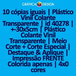 10 cópias iguais | Plástico Vinil Colante Transparente | id 40278 | +-30x5cm | Plástico Colante Vinil Transparente | Meio Corte + Corte Especial | Destaque & Aplique | Impressão FRENTE Colorida apenas | 4x0 cores