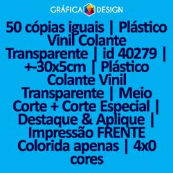 50 cópias iguais | Plástico Vinil Colante Transparente | id 40279 | +-30x5cm | Plástico Colante Vinil Transparente | Meio Corte + Corte Especial | Destaque & Aplique | Impressão FRENTE Colorida apenas | 4x0 cores