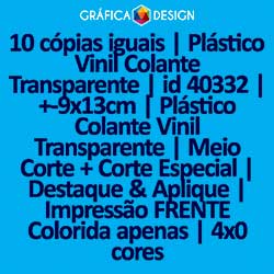 10 cópias iguais | Plástico Vinil Colante Transparente | id 40332 | +-9x13cm | Plástico Colante Vinil Transparente | Meio Corte + Corte Especial | Destaque & Aplique | Impressão FRENTE Colorida apenas | 4x0 cores