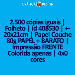 2.500 cópias iguais | Folheto | id 408530 | +-20x21cm | Papel Couchê 80g PAPEL + BARATO | Impressão FRENTE Colorida apenas | 4x0 cores
