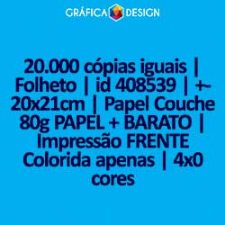 20.000 cópias iguais | Folheto | id 408539 | +-20x21cm | Papel Couchê 80g PAPEL + BARATO | Impressão FRENTE Colorida apenas | 4x0 cores