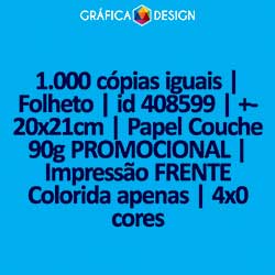 1.000 cópias iguais | Folheto | id 408599 | +-20x21cm | Papel Couchê 90g PROMOCIONAL | Impressão FRENTE Colorida apenas | 4x0 cores