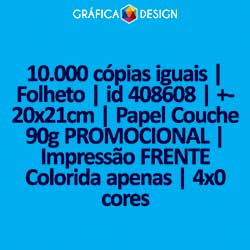10.000 cópias iguais | Folheto | id 408608 | +-20x21cm | Papel Couchê 90g PROMOCIONAL | Impressão FRENTE Colorida apenas | 4x0 cores