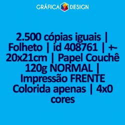 2.500 cópias iguais | Folheto | id 408761 | +-20x21cm | Papel Couchê 120g NORMAL | Impressão FRENTE Colorida apenas | 4x0 cores