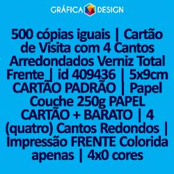 500 cópias iguais | Cartão de Visita com 4 Cantos Arredondados Verniz Total Frente | id 409436 | 5x9cm CARTÃO PADRÃO | Papel Couchê 250g PAPEL CARTÃO + BARATO | 4 (quatro) Cantos Redondos | Impressão FRENTE Colorida apenas | 4x0 cores