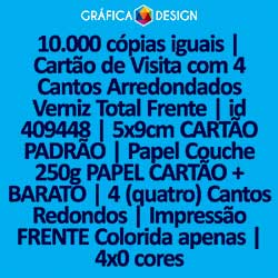 10.000 cópias iguais | Cartão de Visita com 4 Cantos Arredondados Verniz Total Frente | id 409448 | 5x9cm CARTÃO PADRÃO | Papel Couchê 250g PAPEL CARTÃO + BARATO | 4 (quatro) Cantos Redondos | Impressão FRENTE Colorida apenas | 4x0 cores