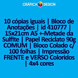 10 cópias iguais | Bloco de Anotações | id 410777 | 15x21cm A5 +-Metade da Sulfite | Papel Reciclato 90g COMUM | Bloco Colado c/ 100 folhas | Impressão FRENTE e VERSO Coloridos | 4x4 cores