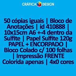 50 cópias iguais | Bloco de Anotações | id 410888 | 10x15cm A6 +-4 dentro da Sulfite | Papel Sulfite 120g PAPEL + ENCORPADO | Bloco Colado c/ 100 folhas | Impressão FRENTE Colorida apenas | 4x0 cores