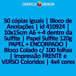 50 cópias iguais | Bloco de Anotações | id 410924 | 10x15cm A6 +-4 dentro da Sulfite | Papel Sulfite 120g PAPEL + ENCORPADO | Bloco Colado c/ 100 folhas | Impressão FRENTE e VERSO Coloridos | 4x4 cores