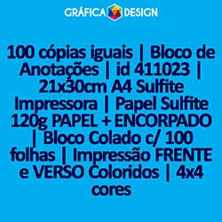 100 cópias iguais | Bloco de Anotações | id 411023 | 21x30cm A4 Sulfite Impressora | Papel Sulfite 120g PAPEL + ENCORPADO | Bloco Colado c/ 100 folhas | Impressão FRENTE e VERSO Coloridos | 4x4 cores