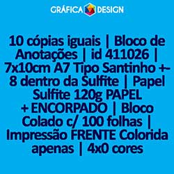 E-mail LUIZ@GRAFICA.DESIGN10 cópias iguais | Bloco de Anotações | id 411026 | 7x10cm A7 Tipo Santinho +-8 dentro da Sulfite | Papel Sulfite 120g PAPEL + ENCORPADO | Bloco Colado c/ 100 folhas | Impressão FRENTE Colorida apenas | 4x0 cores