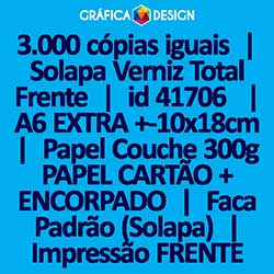 3.000 cópias iguais | Solapa Verniz Total Frente | id 41706 | 18x10cm A6 EXTRA | DL Reduzido | Papel Couchê 300g PAPEL CARTÃO + ENCORPADO | Faca Corte Padrão | Impressão FRENTE Colorida apenas | 4x0 cores