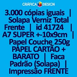 3.000 cópias iguais | Solapa Verniz Total Frente | id 41724 | 10x9cm A7 SUPER | Papel Couchê 250g PAPEL CARTÃO + BARATO | Faca Corte Padrão | Impressão FRENTE Colorida apenas | 4x0 cores