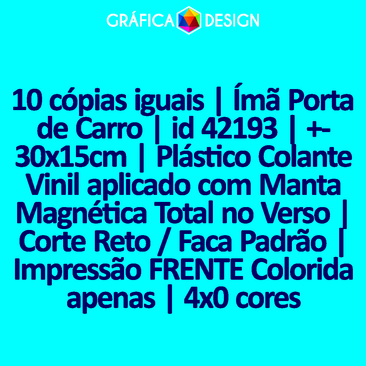 10 cópias iguais | Ímã Porta de Carro | id 42193 | +-30x15cm | Plástico Colante Vinil aplicado com Manta Magnética Total no Verso | Corte Reto / Faca Padrão | Impressão FRENTE Colorida apenas | 4x0 cores