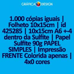1.000 cópias iguais | Folheto 10x15cm | id 425285 | 10x15cm A6 +-4 dentro da Sulfite | Papel Sulfite 90g PAPEL SIMPLES | Impressão FRENTE Colorida apenas | 4x0 cores