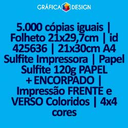 5.000 cópias iguais | Folheto 21x29,7cm | id 425636 | 21x30cm A4 Sulfite Impressora | Papel Sulfite 120g PAPEL + ENCORPADO | Impressão FRENTE e VERSO Coloridos | 4x4 cores