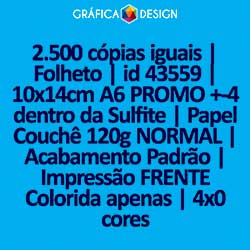 2.500 cópias iguais | Folheto | id 43559 | 10x14cm A6 PROMO +-4 dentro da Sulfite | Papel Couchê 120g NORMAL | Impressão FRENTE Colorida apenas | 4x0 cores