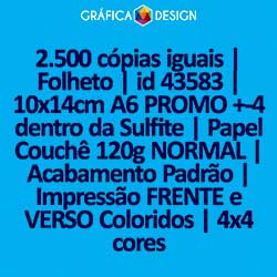 2.500 cópias iguais | Folheto | id 43583 | 10x14cm A6 PROMO +-4 dentro da Sulfite | Papel Couchê 120g NORMAL | Impressão FRENTE e VERSO Coloridos | 4x4 cores