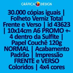 30.000 cópias iguais | Folheto Verniz Total Frente e Verso | id 43623 | 10x14cm A6 PROMO +-4 dentro da Sulfite | Papel Couchê 120g NORMAL | Impressão FRENTE e VERSO Coloridos | 4x4 cores