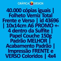 40.000 cópias iguais | Folheto Verniz Total Frente e Verso | id 43696 | 10x14cm A6 PROMO +-4 dentro da Sulfite | Papel Couchê 150g Padrão MELHOR | Impressão FRENTE e VERSO Coloridos | 4x4 cores