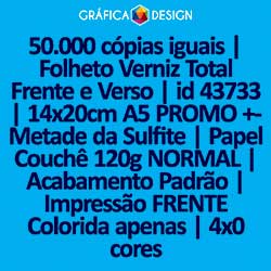 50.000 cópias iguais | Folheto Verniz Total Frente e Verso | id 43733 | 14x20cm A5 PROMO +-Metade da Sulfite | Papel Couchê 120g NORMAL | Impressão FRENTE Colorida apenas | 4x0 cores