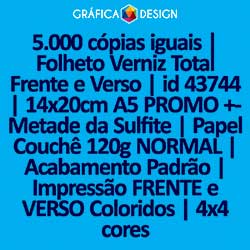 5.000 cópias iguais | Folheto Verniz Total Frente e Verso | id 43744 | 14x20cm A5 PROMO +-Metade da Sulfite | Papel Couchê 120g NORMAL | Impressão FRENTE e VERSO Coloridos | 4x4 cores